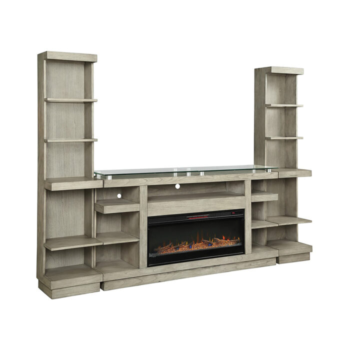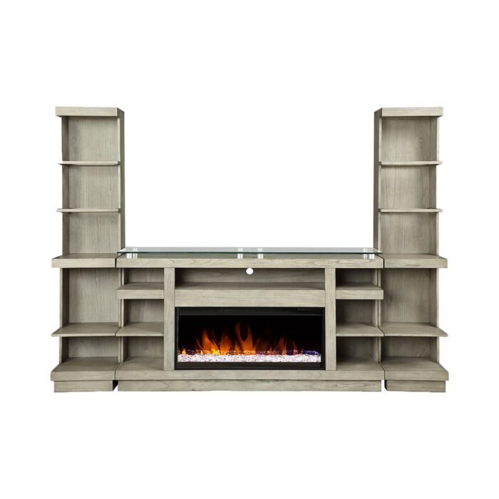 The Celino Curio Pier Cabinet, Set of 2, is designed to seamlessly integrate with the Celino TV Stand and Fireplace Stand, forming a sophisticated entertainment ensemble. These cabinets boast LED lighting and offer a mix of open, framed-glass, and wooden shelving options. Their sleek, contemporary design enhances the modern appeal of any living space.