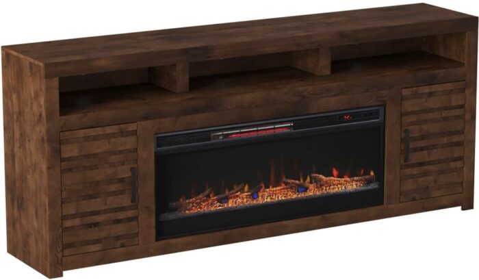 The Sausalito 79″ Fireplace Console combines a straight forward design and fine whiskey finish on Knotty Alder to create a dynamic piece. Holds up to an 89″ TV and contains a 42″ fireplace insert with clear crystals and traditional log set with embers to keep you toasty while binge watching your favorite TV show or movie.