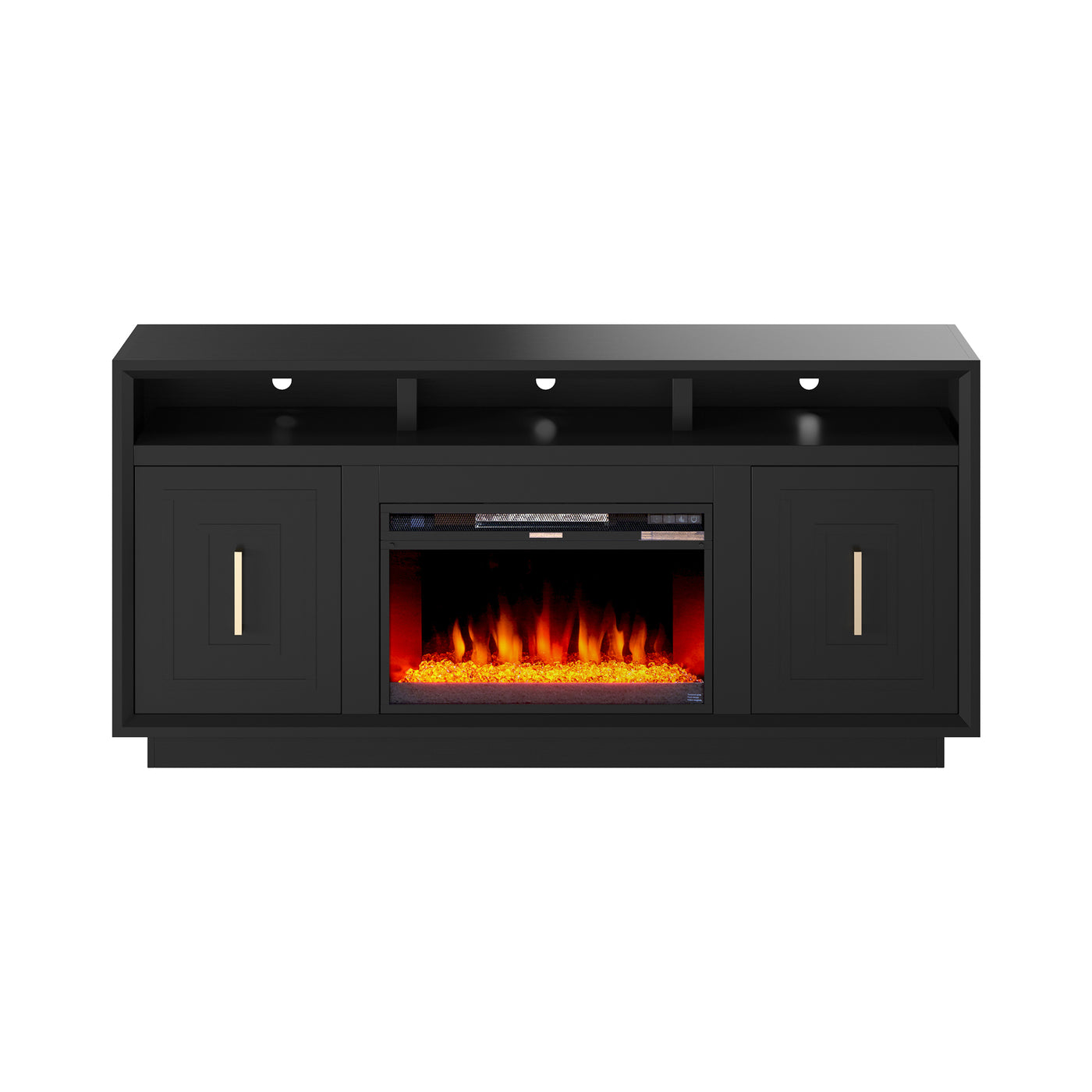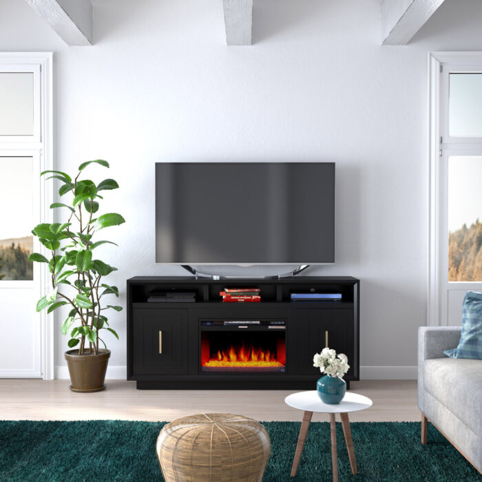 The Sunset 68″ Fireplace TV Stand combines modern elegance with functionality, featuring a sleek black finish and stylish nickel hardware. It supports TVs up to 80″ and offers ample storage for all your media essentials. This unit includes a 26″ fireplace insert, complete with both crystal rocks and a traditional log set, ensuring a cozy ambiance for your entertainment sessions.