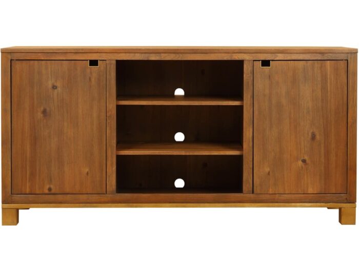Our Latch Lock consoles are “No tool Assembly” and are easy to put together. The Tina 60″ TV Console holds up to a 69″ TV and features beautifully smooth wood grained doors and inset gold door pulls. It’s woodsy look and appeal makes this a great addition to any room.